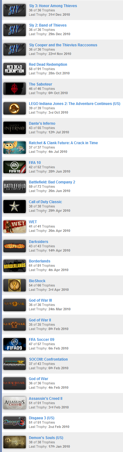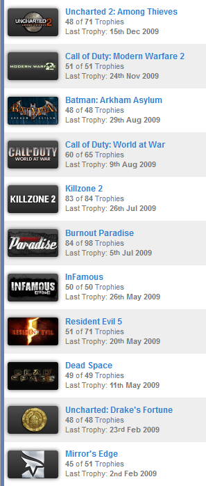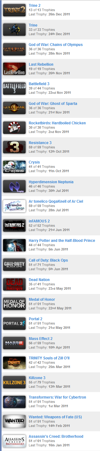Algo de lo que más me atrapo de la PS3, al igual que lo hicieron antes muchísimos MMOs es el tema de tener trofeos. En los juegos online, y muchísimos juegos mucho antes, esto se llamaba títulos, y se te otorgaban por lograr ciertos méritos dentro del título: Matar 20 sapos, te otorgaban el título de «Asesino de Sapos» y así. Los trofeos funcionan igual, y yo al poseer ciertas tendencias compulsivas, me encontre prontamente adicto a ellos. Desde mi primer platino alla por el 30 de Diciembre del 2008, decidí que iba a ser lo humanamente posible para platinar cuanto juego disfrutase, y dudo que haya comprado un título por platino fácil, y no por que en primera instancia era un juego que me gustaba. Otro dato es que me tomo todo Octubre, todo Noviembre y casi todo Diciembre, es decir 3 meses en sacar mi primer trophy máximo, Les invinto a ver una línea del con los -por ahora- 59 trofeos que he sacado en estos ya tres años: